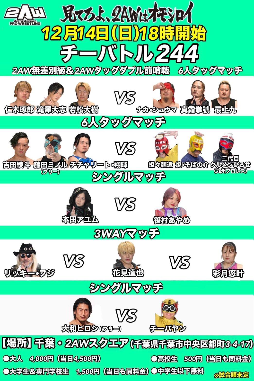 2AWÄê´üÂç²ñ ǯÆâ¥é¥¹¥È¥Á¡¼¥Ð¥È¥ë¡ª¡ª2AW̵º¹Ê̵éÁ°¾¥Àï ¿ÎÌÚ vs ¥Ê¥«¡¢2AW¥¿¥Ã¥°Á°¾¥Àï ¿¿Áú¡õºÇ¾å vs Âìß·¡õ¼ã¾¾¤Î¥À¥Ö¥ëÁ°¾¥Àï¤Û¤«Á´5»î¹ç¤òͽÄê¡£